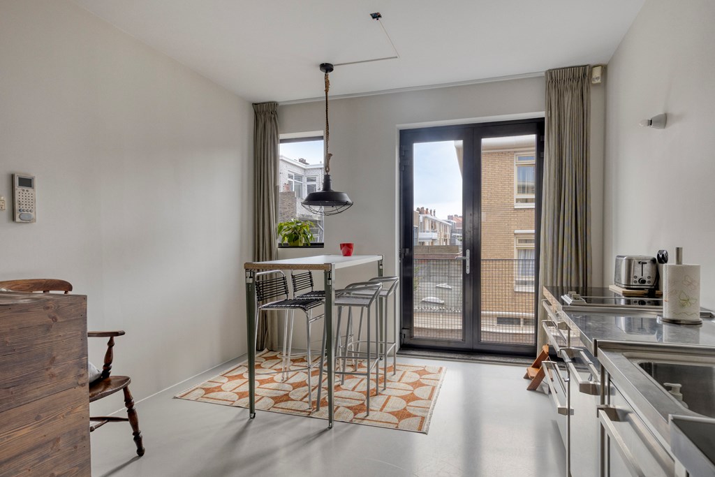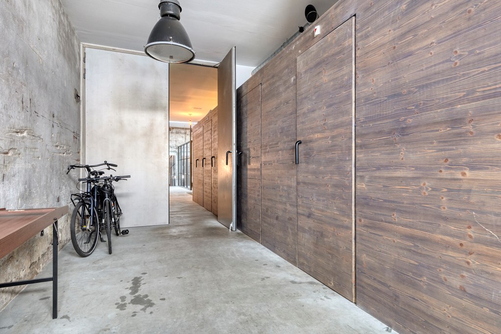 Eerste verdieping : Open verdieping met een compacte RVS keukenunit, een lange kastruimte en een brede glazen schuifpui aan het besloten terras. Het terras is 27m2 groot en heeft een plantenborder en een dakraam naar de lager gelegen studio. Aan de voorzijde van deze verdieping is een frans balkon met glazen deuren op de plaats van de oude pakhuisdeuren.