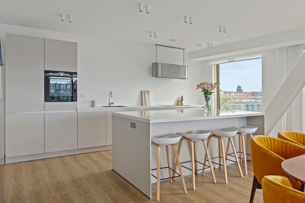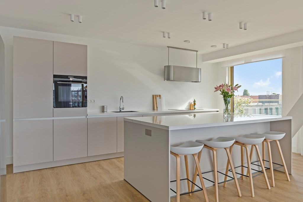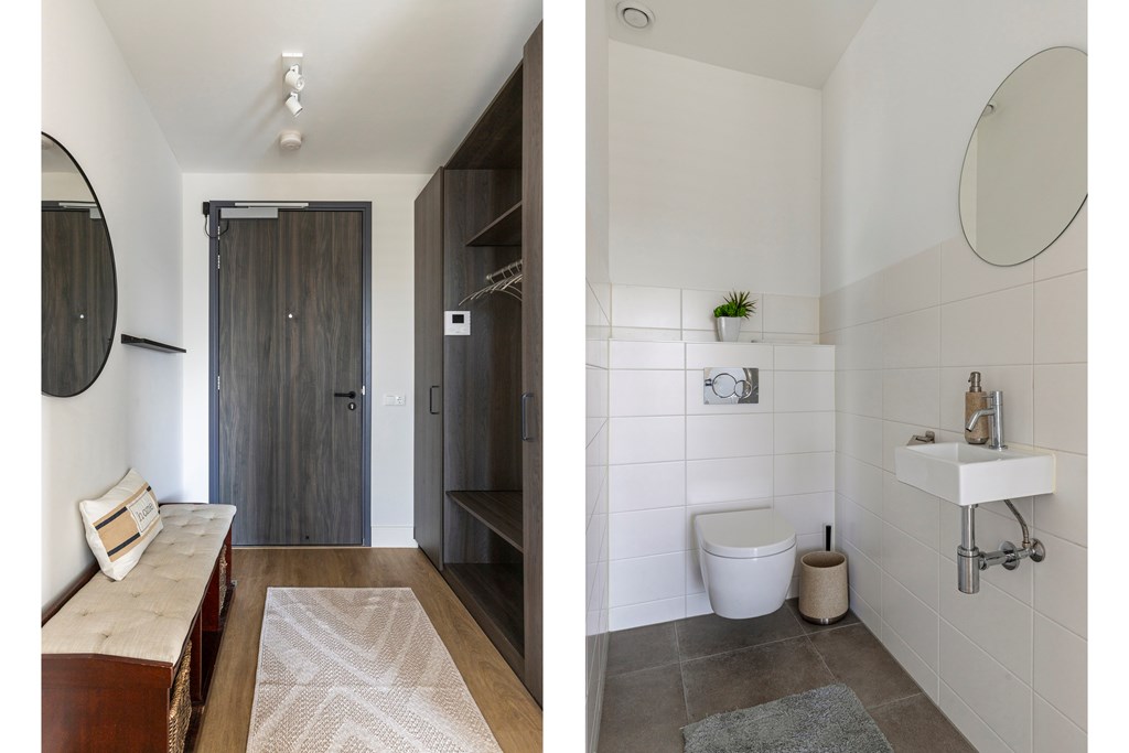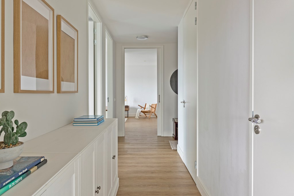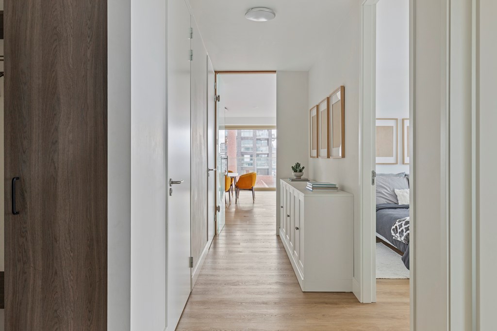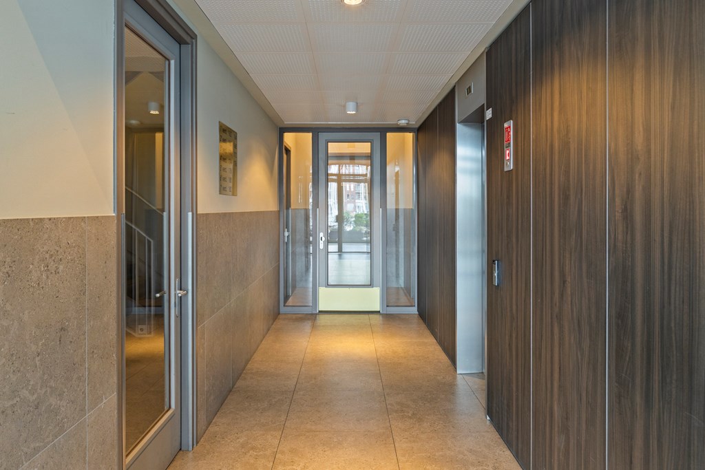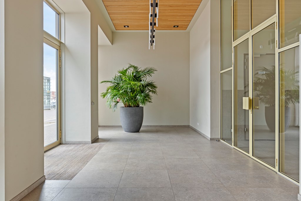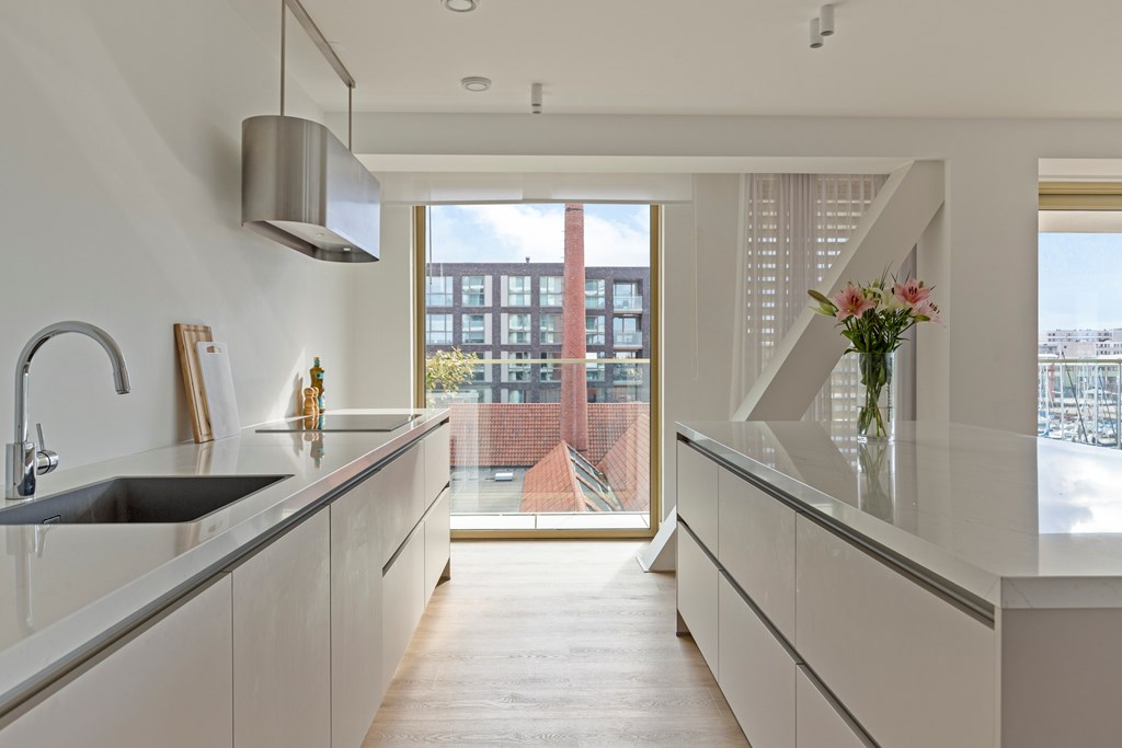 Via de moderne gezamenlijke entree bereikt u per lift of trap de derde verdieping. De ruime hal leidt naar de lichte woonkamer met open leef keuken. Dankzij de grote schuifpui betrekt u het royale terras eenvoudig bij de living: binnen en buiten vloeien hier naadloos samen.