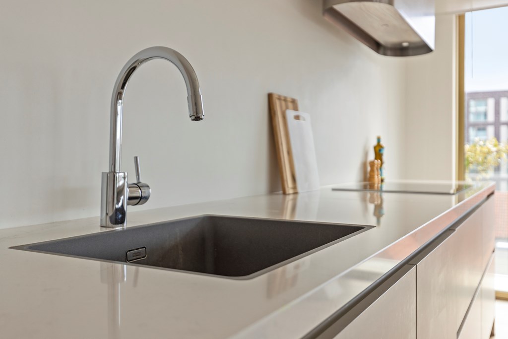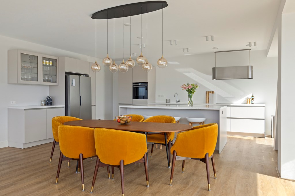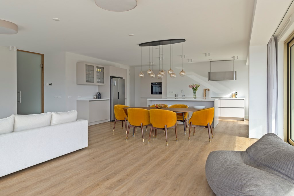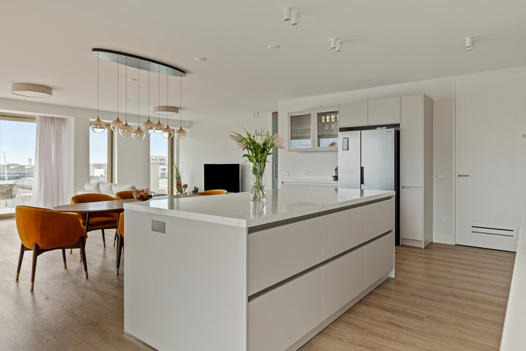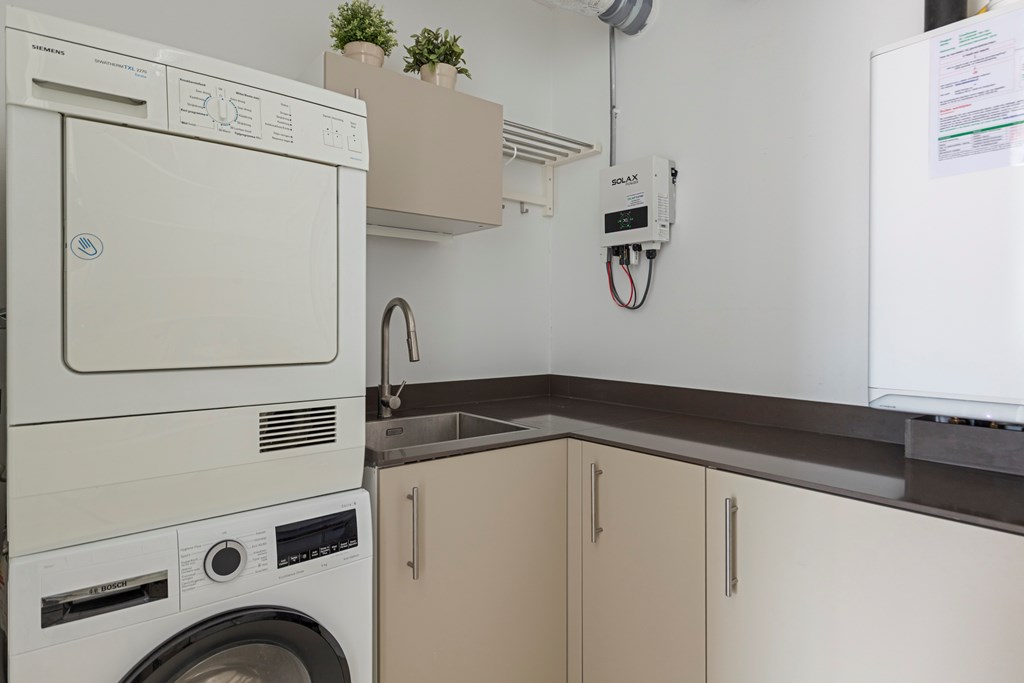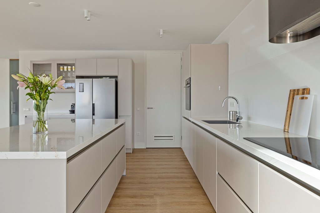 De luxe keuken is uitgerust met een inductiekookplaat met geïntegreerd afzuigsysteem, oven, vaatwasser en koel-vriescombinatie. Aangrenzend vindt u de bijkeuken met wasmachine en droger.