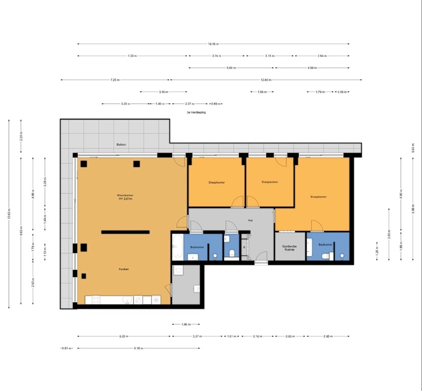 Het appartement beschikt over drie ruime slaapkamers, een inloopkast en twee stijlvolle badkamers. De eerste badkamer heeft een inloopdouche, toilet en wastafel; de tweede een ligbad, inloopdouche en wastafel. Het hele appartement is voorzien van vloerverwarming, uitstekende isolatie en dubbele beglazing – optimaal comfort gegarandeerd.