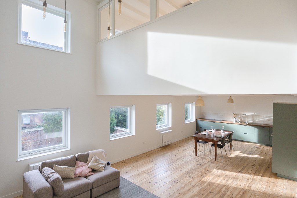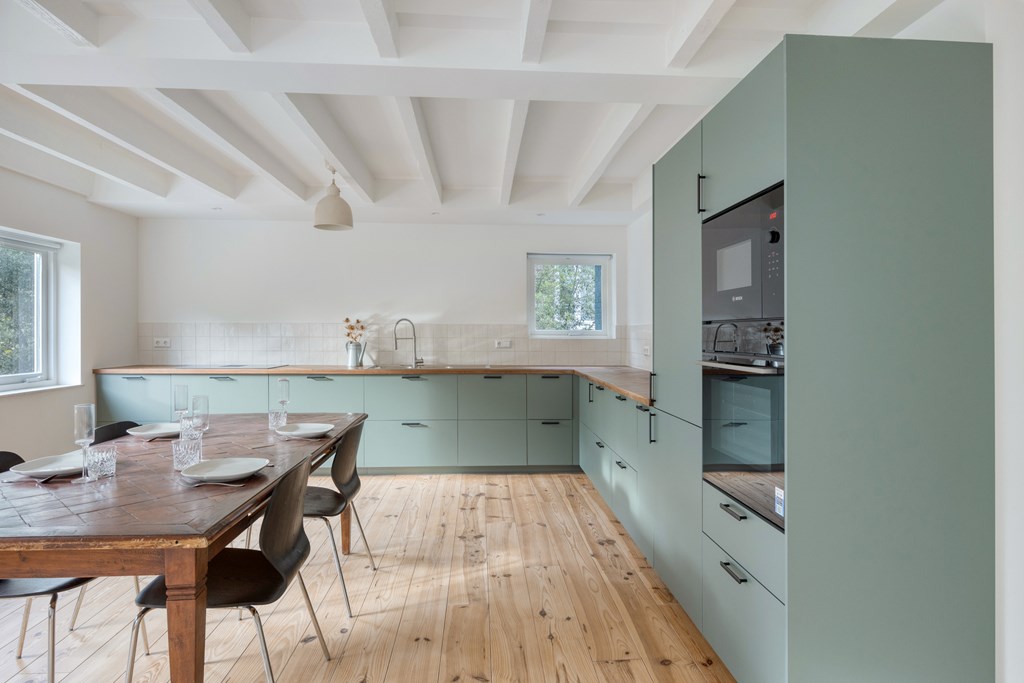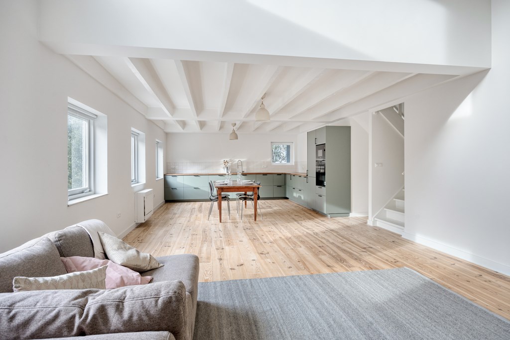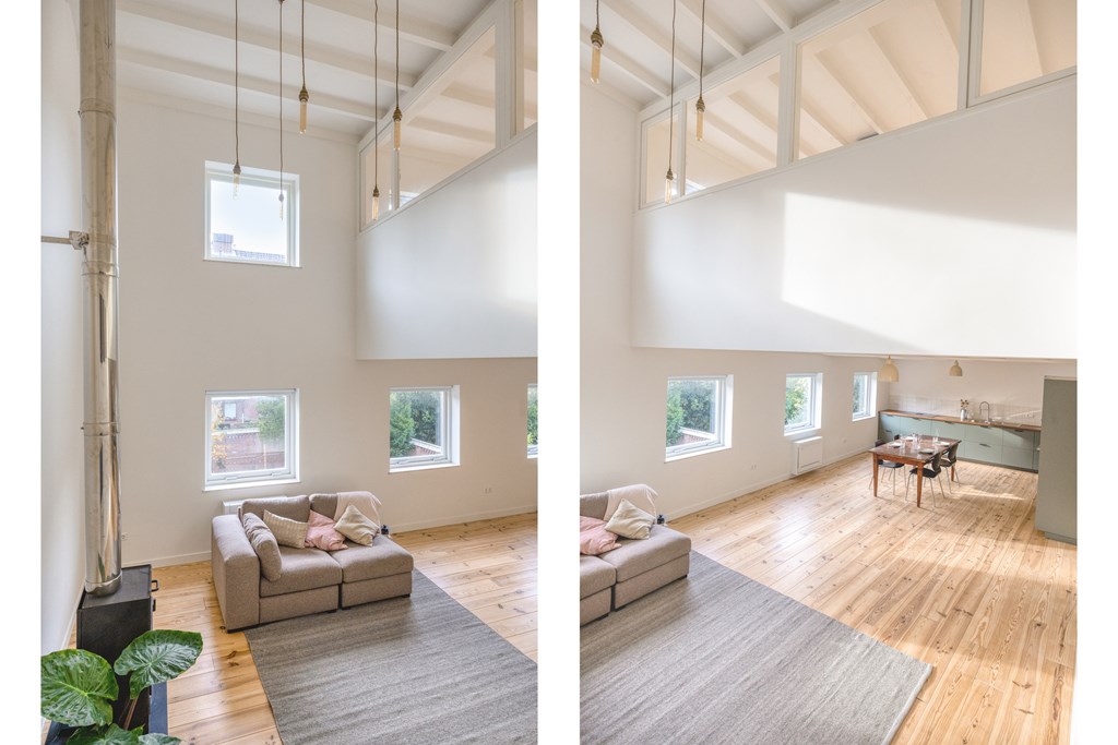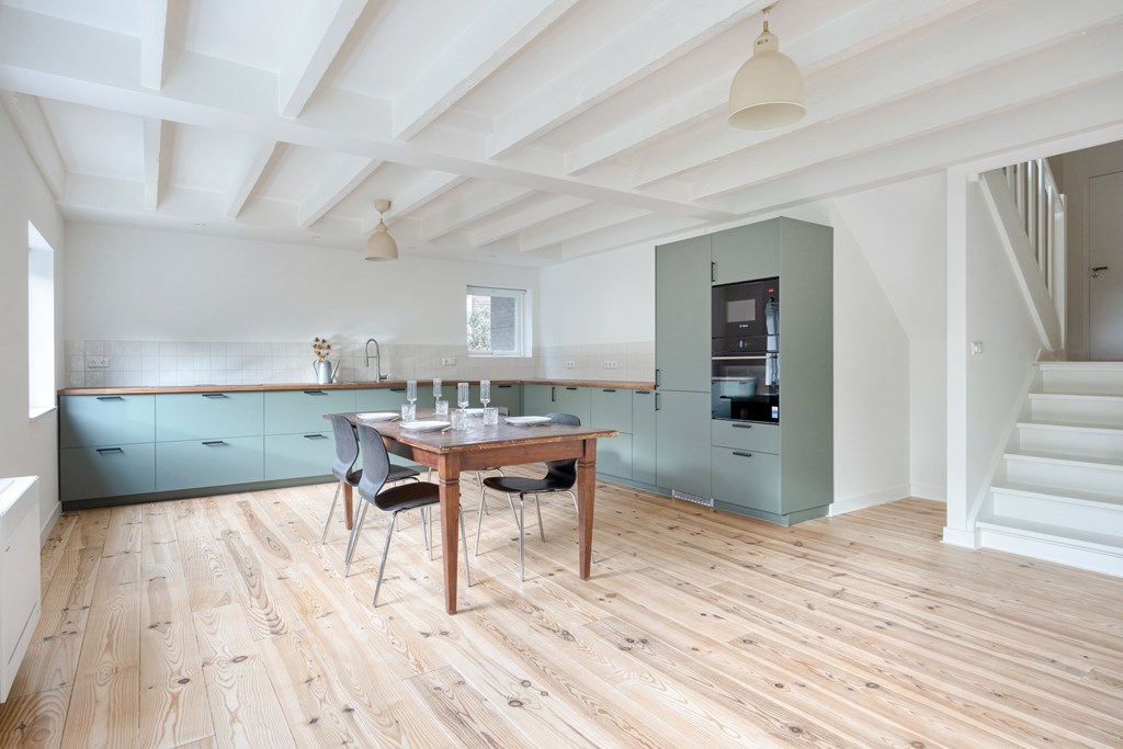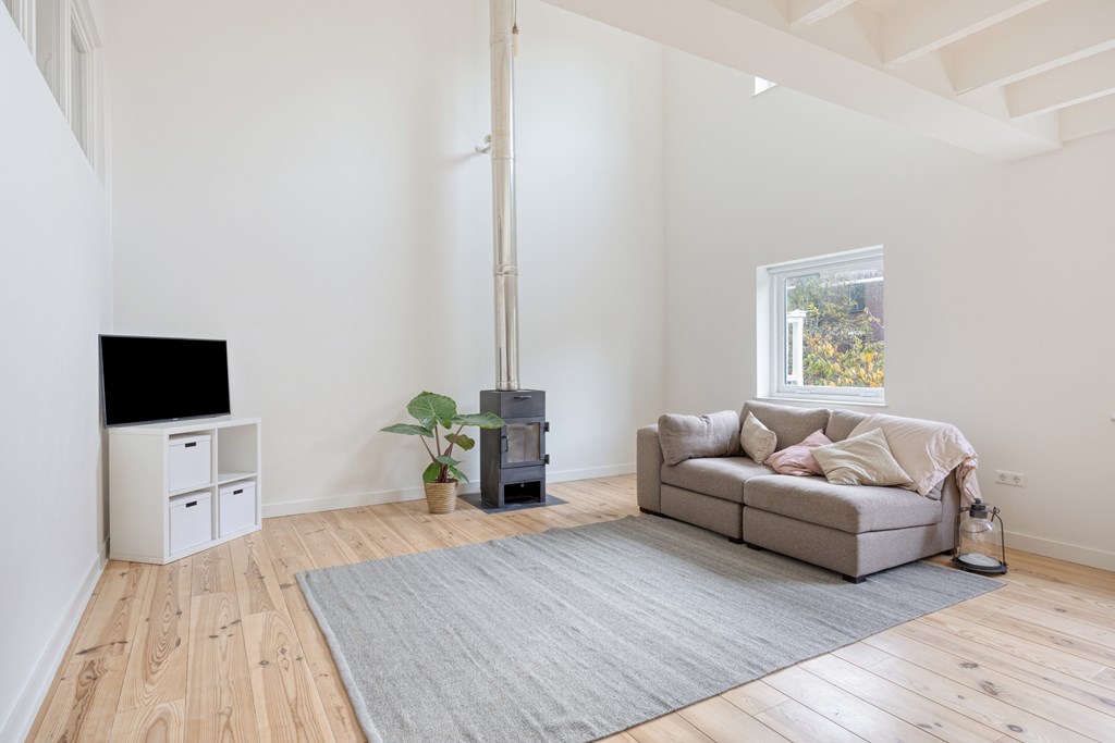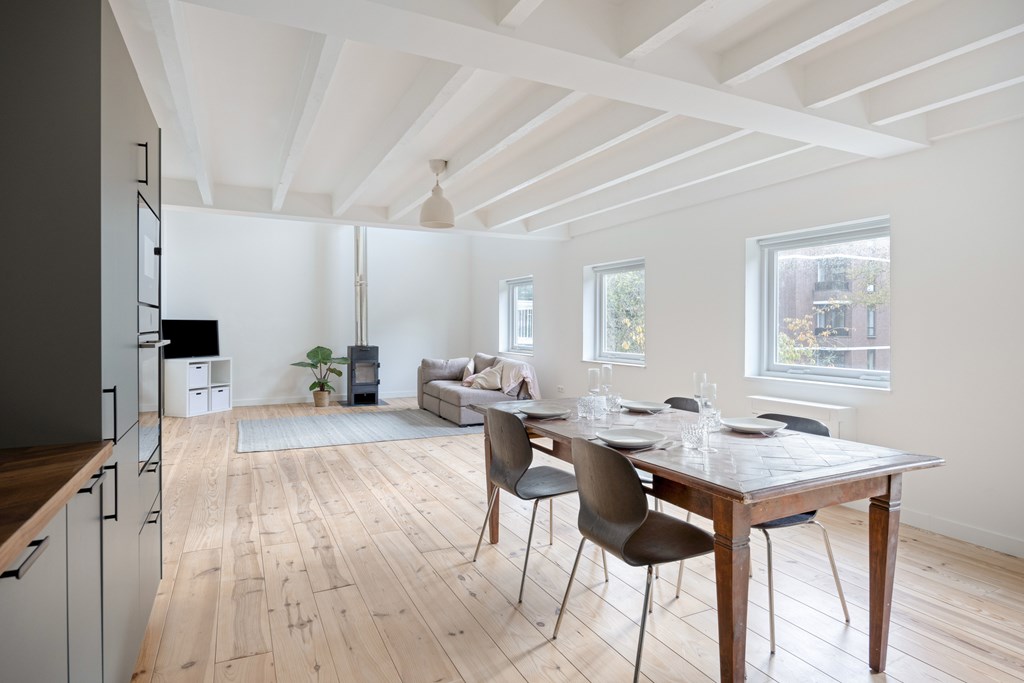 De woonkamer ademt warmte en sfeer, met haar hoge plafonds en prachtige houten balken die nog verwijzen naar het oorspronkelijke karakter van het pand. Een gezellige houtkachel zorgt voor extra comfort tijdens de koude wintermaanden. De natuurlijke overgang tussen keuken en woonkamer maakt de ruimte open en uitnodigend.